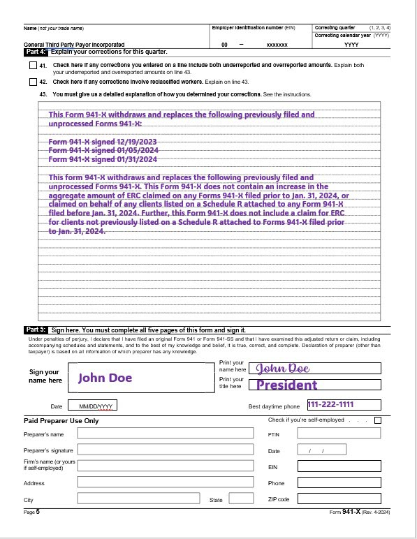 • Verify and include the following statement: “This form 941-X withdraws and replaces the following previously filed and unprocessed Forms 941-X. This Form 941-X does not contain an increase in the aggregate amount of ERC claimed on any Forms 941-X filed prior to Jan. 31, 2024, or claimed on behalf of any clients listed on a Schedule R attached to any Form 941-X filed before Jan. 31, 2024. Further, this Form 941-X does not include a claim for ERC for clients not previously listed on a Schedule R attached to Forms 941-X filed prior to Jan. 31, 2024.” See the sample supplemental claim for ERC below.