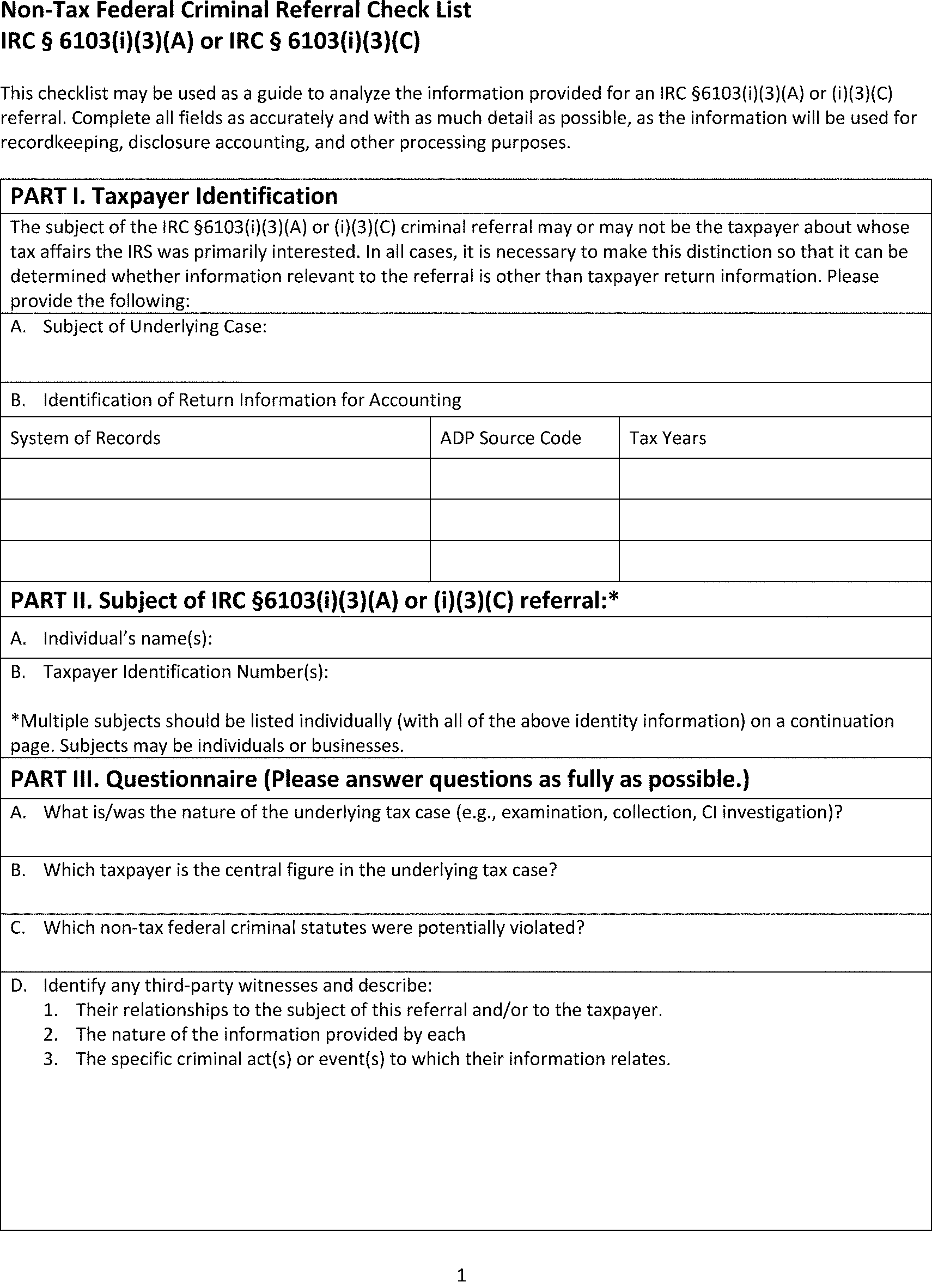 Removed former (1). Information now contained in IRM 11.3.41.8.1(18)and (19), Disclosure Case Processing and Inventory Management, General Case Processing for Disclosure to Department of Justice Under an Ex Parte Court Order Pursuant to IRC 6103(i)(1).
