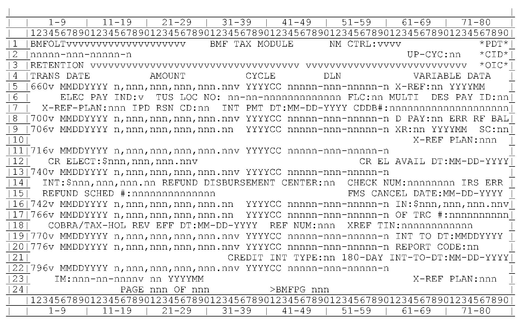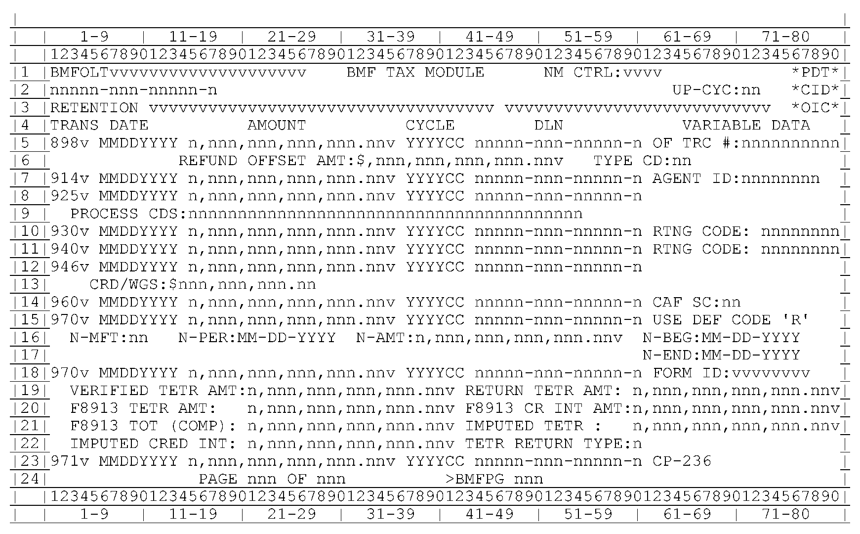 1. This command code is provided to furnish access to the BMF retention tax modules from accounts that merged to a new TIN after the tax module had been dropped to retention. When an account merge takes place, retention modules removed prior to the merge continue to be stored on the retention registers under the old TIN. This command code allows access to those records.