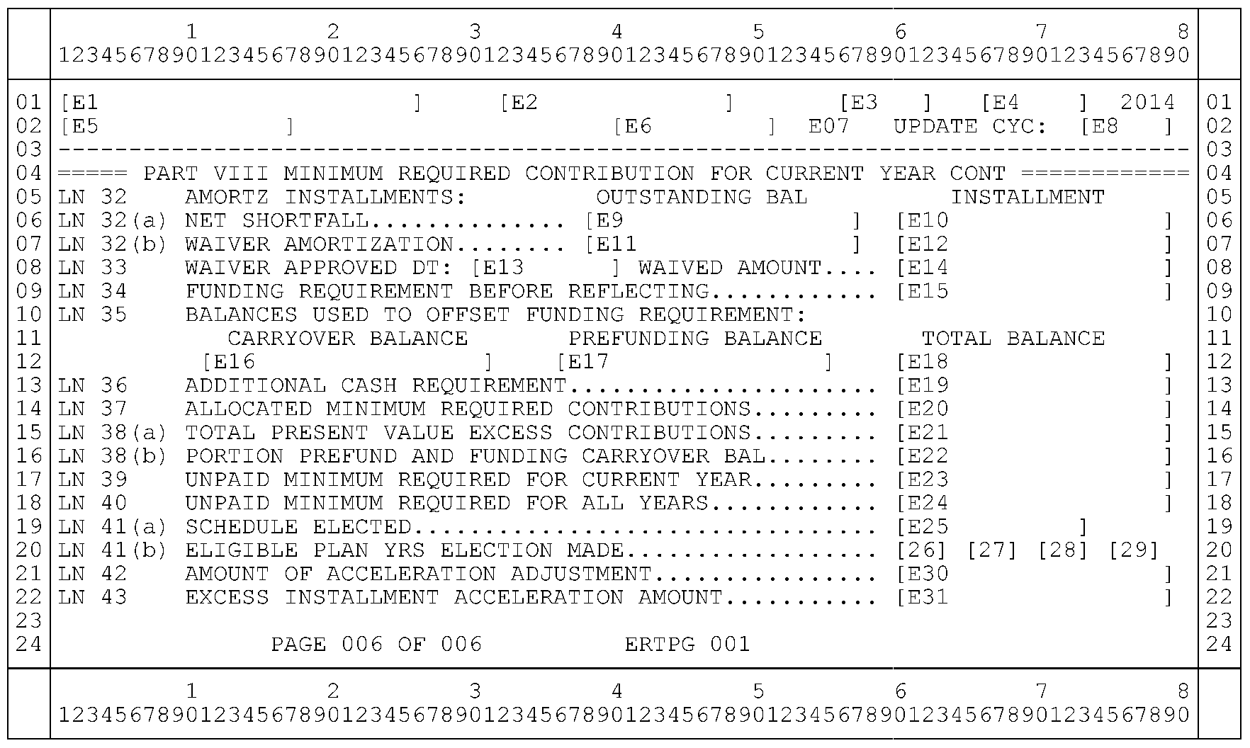 3. Command Code ERTVU is input using an EIN, Plan Number and Tax Period. A one digit definer code is used for all Schedules. Screen positions 1 through 26 are used for Command Code input. The EIN will be edited on input i.e. NN-NNNNNNN. No definer code is needed for Form 5500, Form 5500C/R. Form 5500EZ . Form 5500DCG or Form 5500SF, however a space is required in position 6 of the input request. Requests for processing year 2000 or later data (EFAST) will require a Return Status Code in position 17. If any field is invalid a HELP screen will be displayed.
