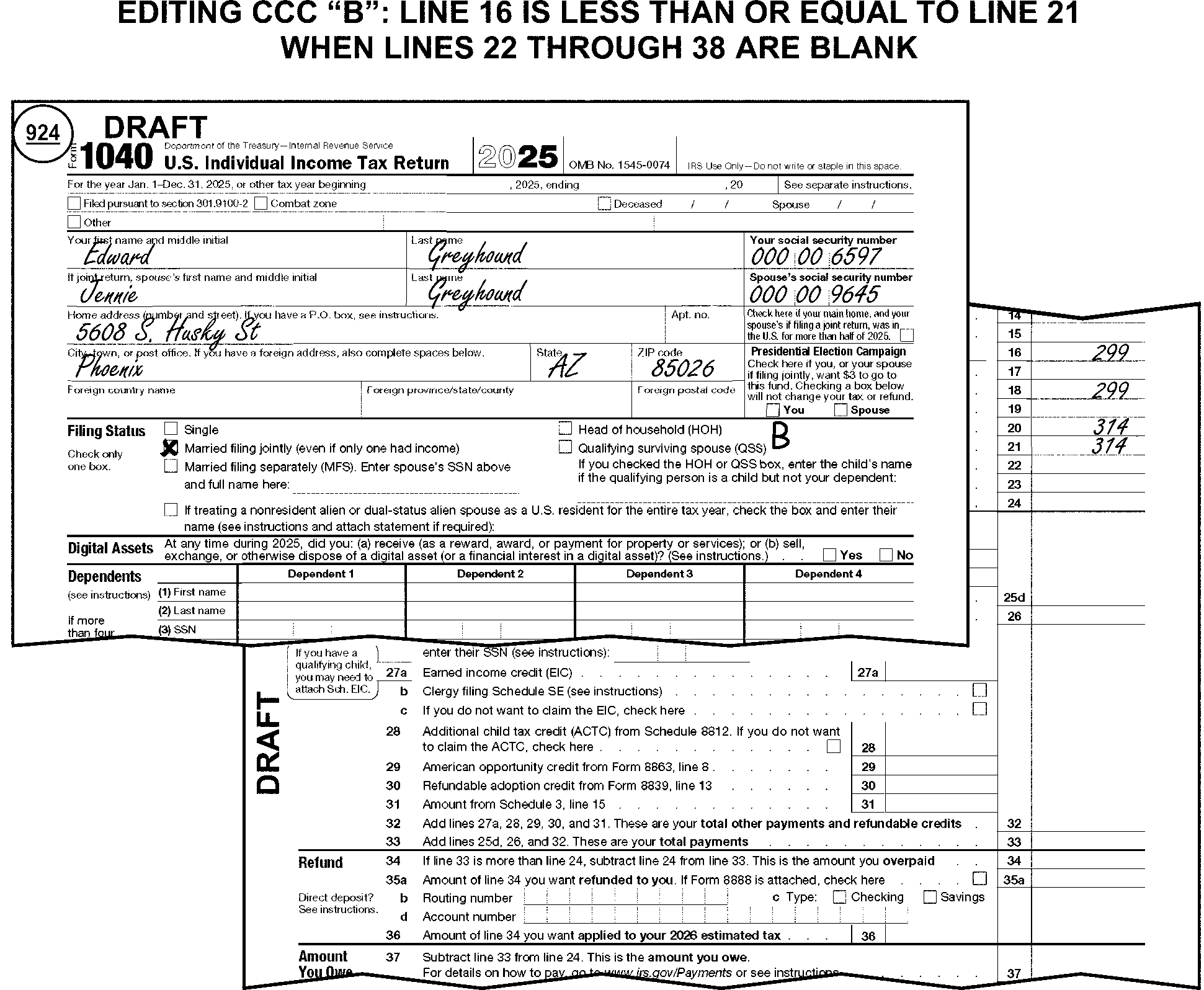 | 38 | Thank You, Second Correspondence (PY) | Thank you for sending us the information we requested. We still need more information. The adjusted gross income transferred from page 1 to page 2 of your return doesn’t match your originally filed return. Send us a newly completed tax return with your original signature(s). Include all forms and schedules required to support your tax return entries. |