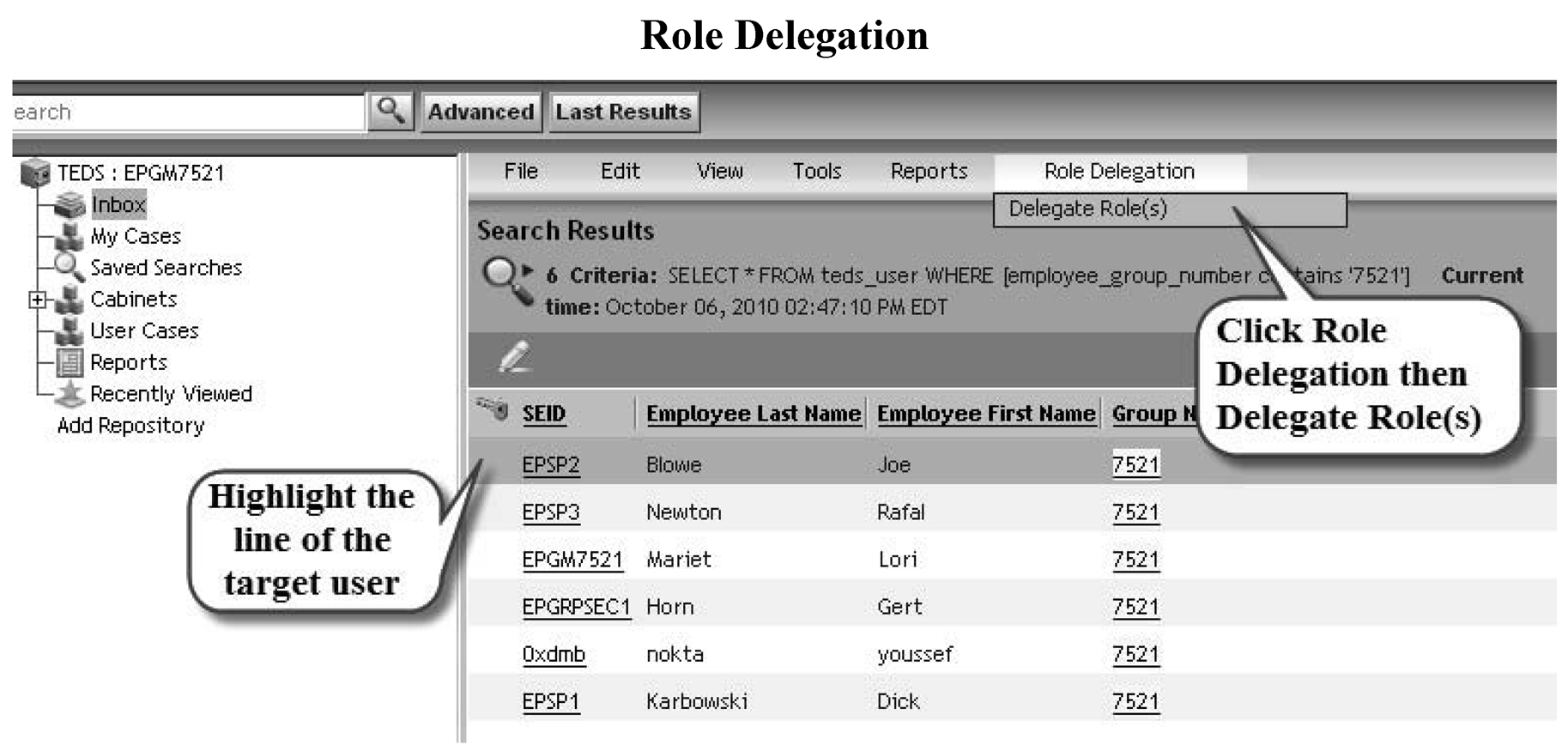 1. To delegate a managerial role, the TEDS user must first identify their target user using TEDS user search.