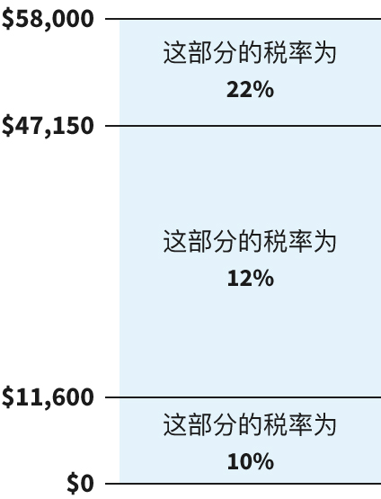 您按收入的等级 (称为税级) 以其所属等级的百分比缴纳税款。随着您的收入增加,高一层收入的税率会更高。